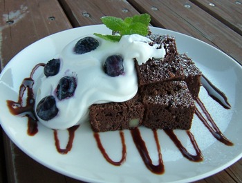 甘いブラウニーに甘くない生クリームとすっぱいブルーベリーが