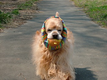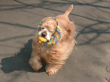 なぜかお散歩にもライオンさんボールを咥えて歩く。