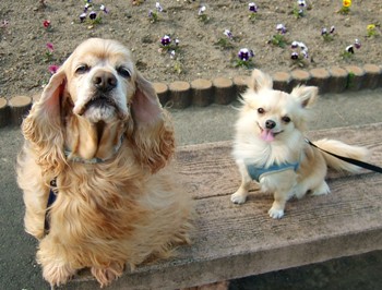 公園のベンチにちっこいワンコ発見!